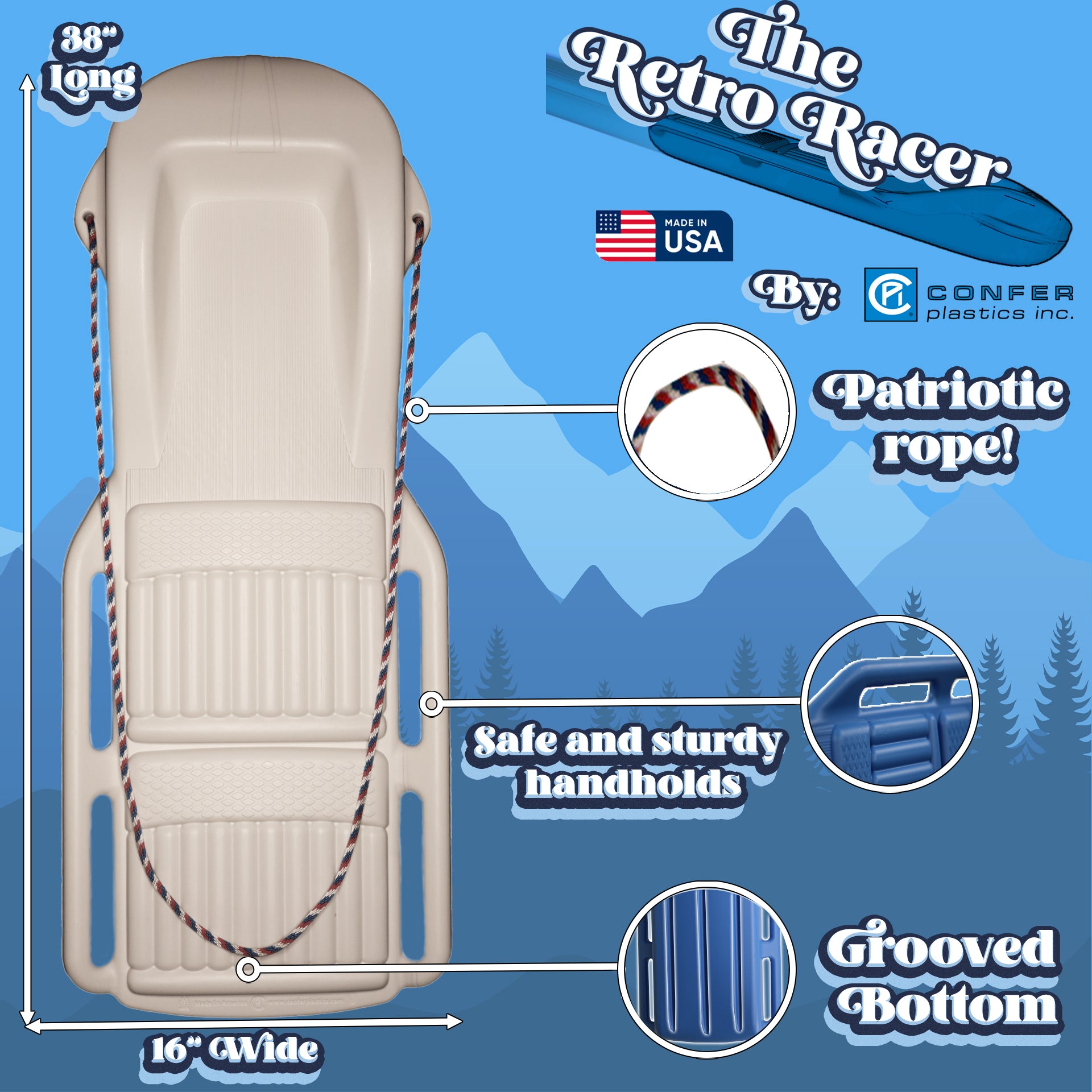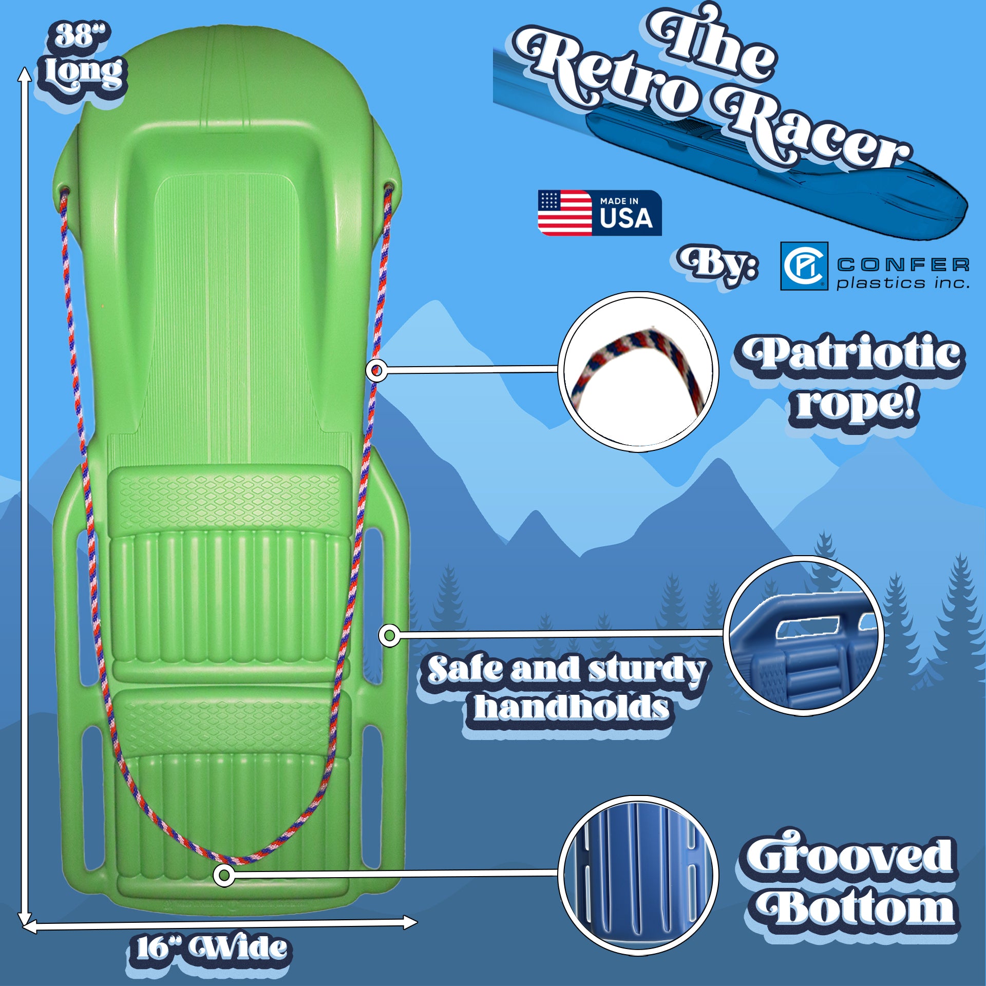 Journey back in time with the Retro Racer sled by Confer Plastics. Originally a favorite of Gen X and older, this sled has been reintroduced due to immense popular demand. Every Retro Racer is a reflection of our rich heritage and values โ symbolizing quality, durability, and environmental consciousness. Whether you're gifting it to a family member, reminiscing about past winter fun, or introducing a new generation to the joys of sledding, the Retro Racer is your perfect companion for the winter season.